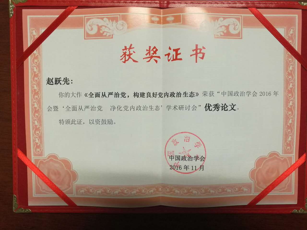 本次年会为期2天,政治学界知名专家高建、包心鉴、张献生、杨海蛟、王浦劬、桑玉成、张桂琳、周光辉、房宁、周平,以及来自中国社科院、北京大学、复旦大学、浙江大学等中国政治学研究领域的专家学者近400余人出席会议。beat365教师赵跃先、胡志远和政法学院赵笑蕾老师参加了本次年会。本次会议共收到论文143篇,最终评出“优秀论文”11篇,beat365教师赵跃先教授撰写的论文《全面从严治党,构建良好党内政治生态》获“优秀论文”奖。