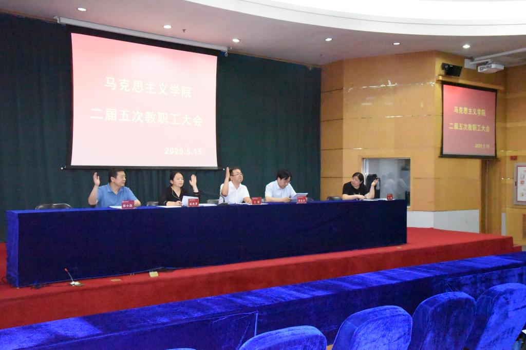 5月15日下午,beat365中文唯一官网二届五次教职工大会在科学会堂二层报告厅召开,学院全体教职工参加大会,院党委副书记孙学虎、副院长赵改萍分别主持开幕式和闭幕式。正值疫情的特殊时期,学院精心组织,认真安排,每个教职工都佩戴了口罩,会议期间大家间隔而坐。