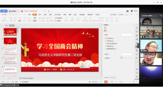 6月10日晚8点,beat365中文唯一官网研究生第二党支部通过线上方式开展了专题党课学习,旨在鼓励支部党员聚焦两会热点,学习两会精神,提升党性修养。此次党课学习由组织委员姜延博主持,由杨海亮书记主讲,支部全体党员参会学习。