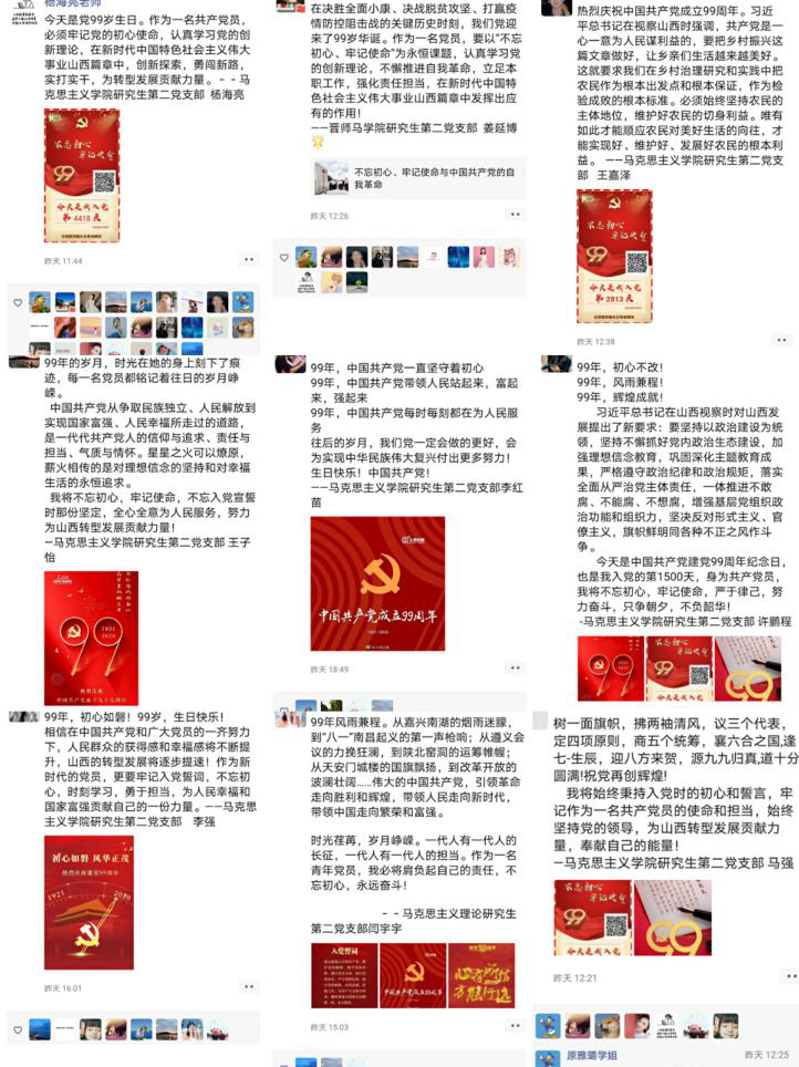 三、亮身份表决心。党员先锋作用必须与具体工作结合起来,必须转化为党员庄严承诺。研究生第二党支部号召党员在微信朋友圈开展“为党庆生、转型有我”活动。活动要求党员要实名做承诺、表决心。个别党员借助共产党员党龄计算器亮明党员党龄。这也是牢记党员身份的有效方式。