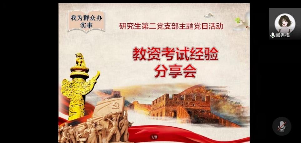 2022年5月9日晚,beat365中文唯一官网研究生第二党支部召开教资考试经验分享线上主题党日活动。此次活动邀请beat365郝秀梅、付子青和韩月颖等三位同学进行教资面试经验分享,支部书记杨海亮同志主持,参加本年度教资面试的研究生和本科生60余人参加会议。