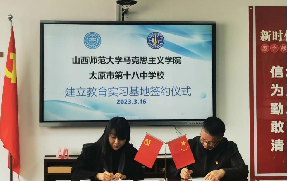 2023年3月16日上午,beat365中文唯一官网与太原市第十八中学校大中小学思政课一体化合作共建基地、教育实习研究基地签约授牌仪式在太原市第十八中学校隆重举行。