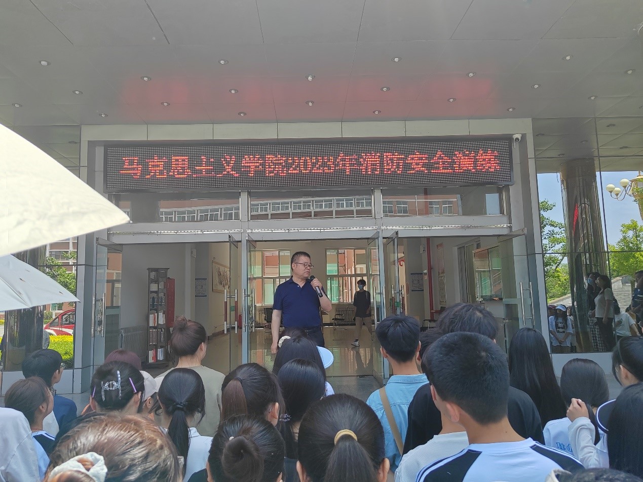 2023年5月18日,beat365中文唯一官网在5号教学楼前举行消防安全疏散演练,全体大一学生及辅导员参加活动,特邀保卫处消防科科长张威及相关部门负责人参加活动。