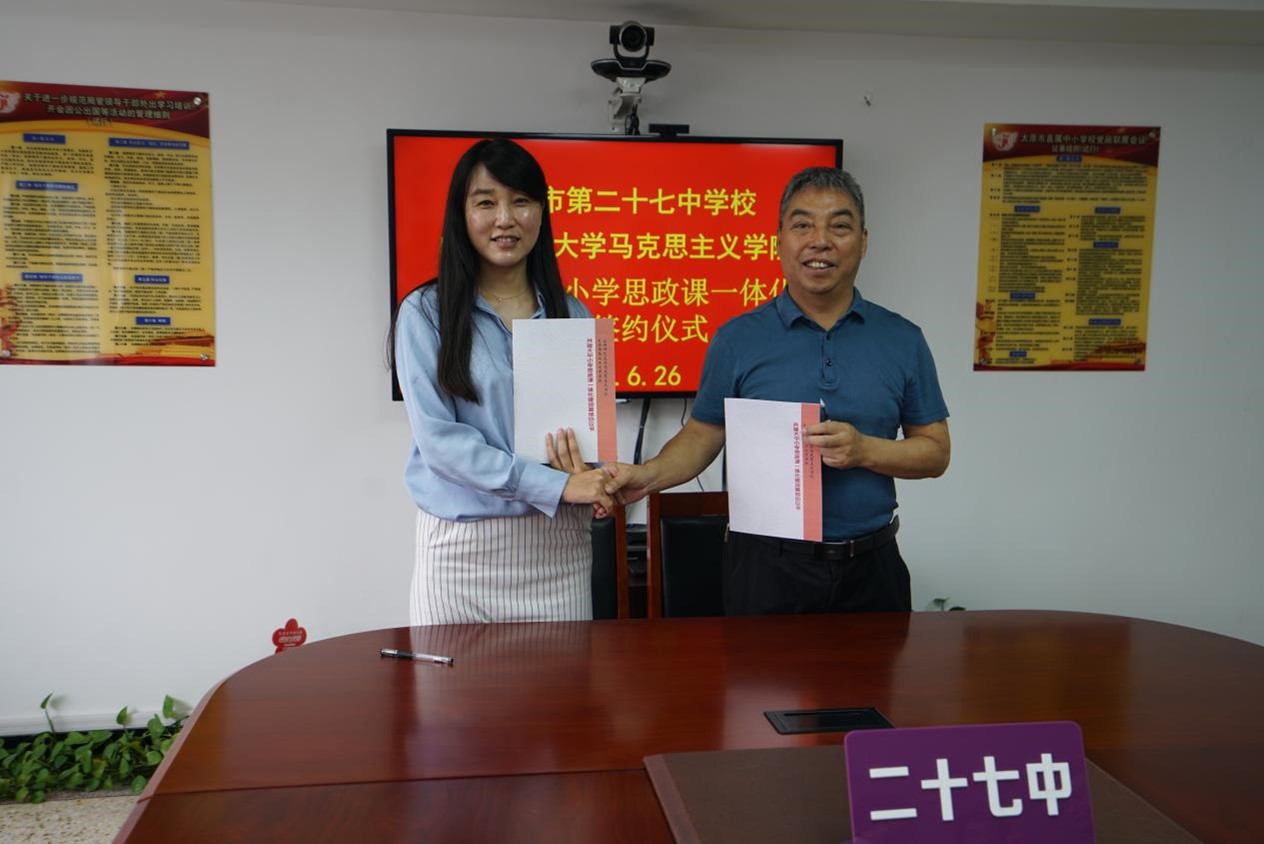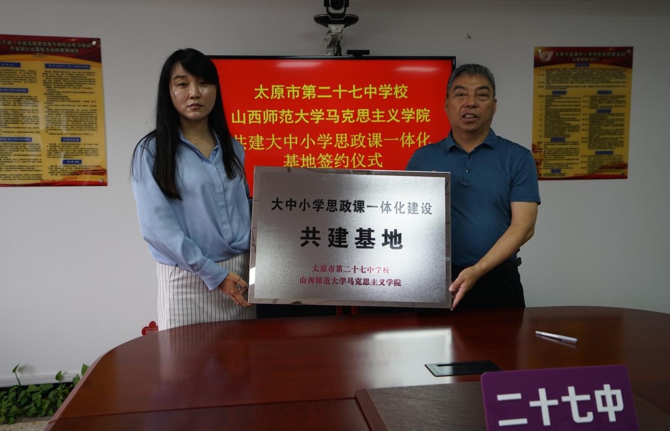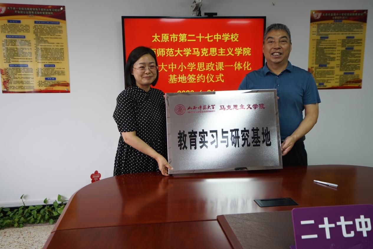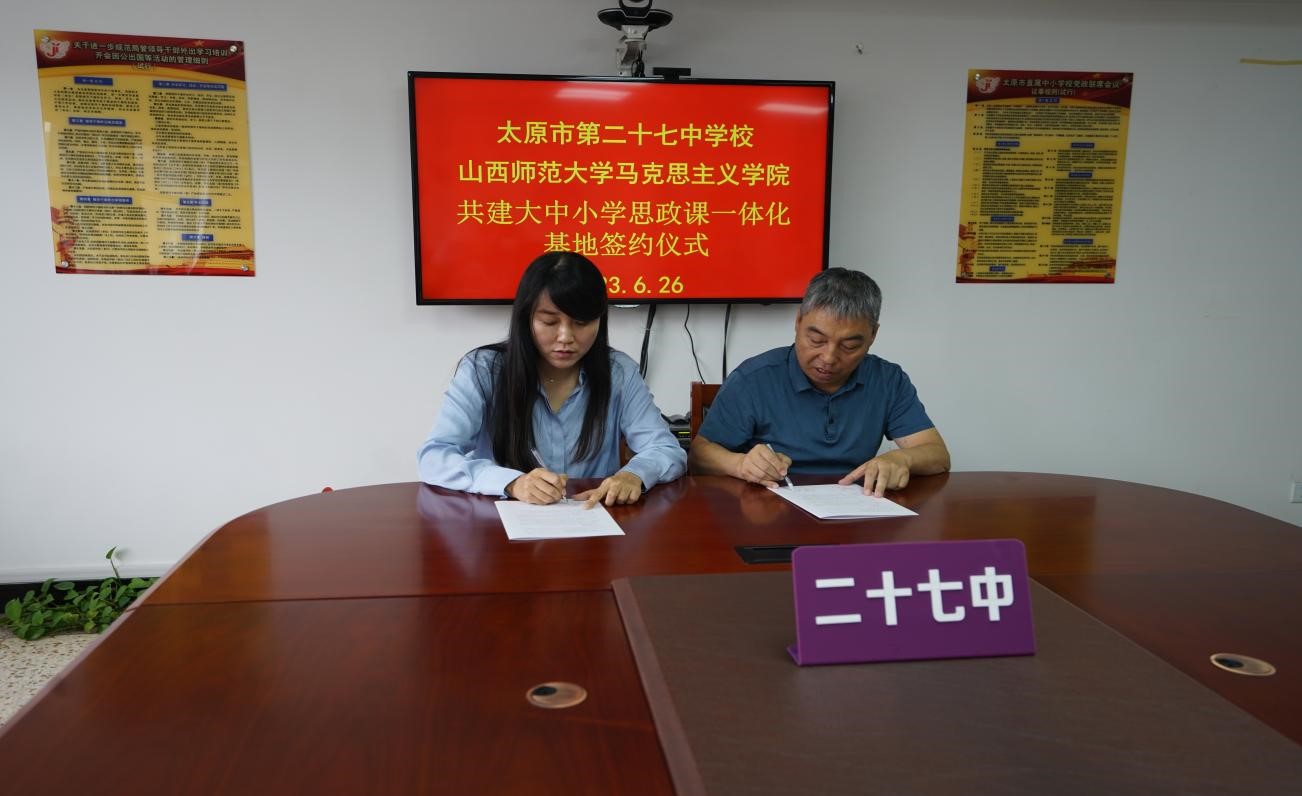 2023年6月26日上午,beat365中文唯一官网与太原市第二十七中学校大中小学思政课一体化建设共建基地、教育实习与研究基地签约授牌仪式在太原市第二十七中学校隆重举行。