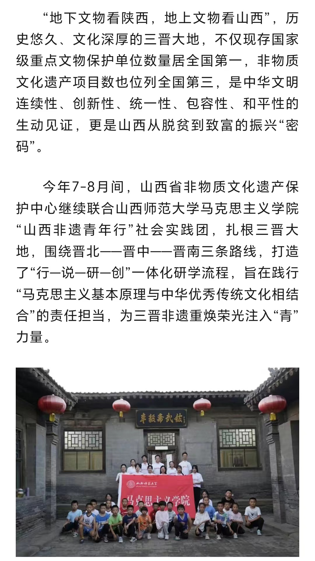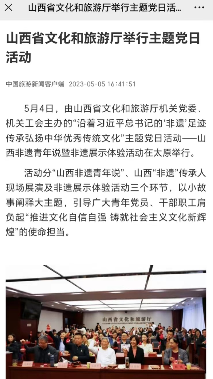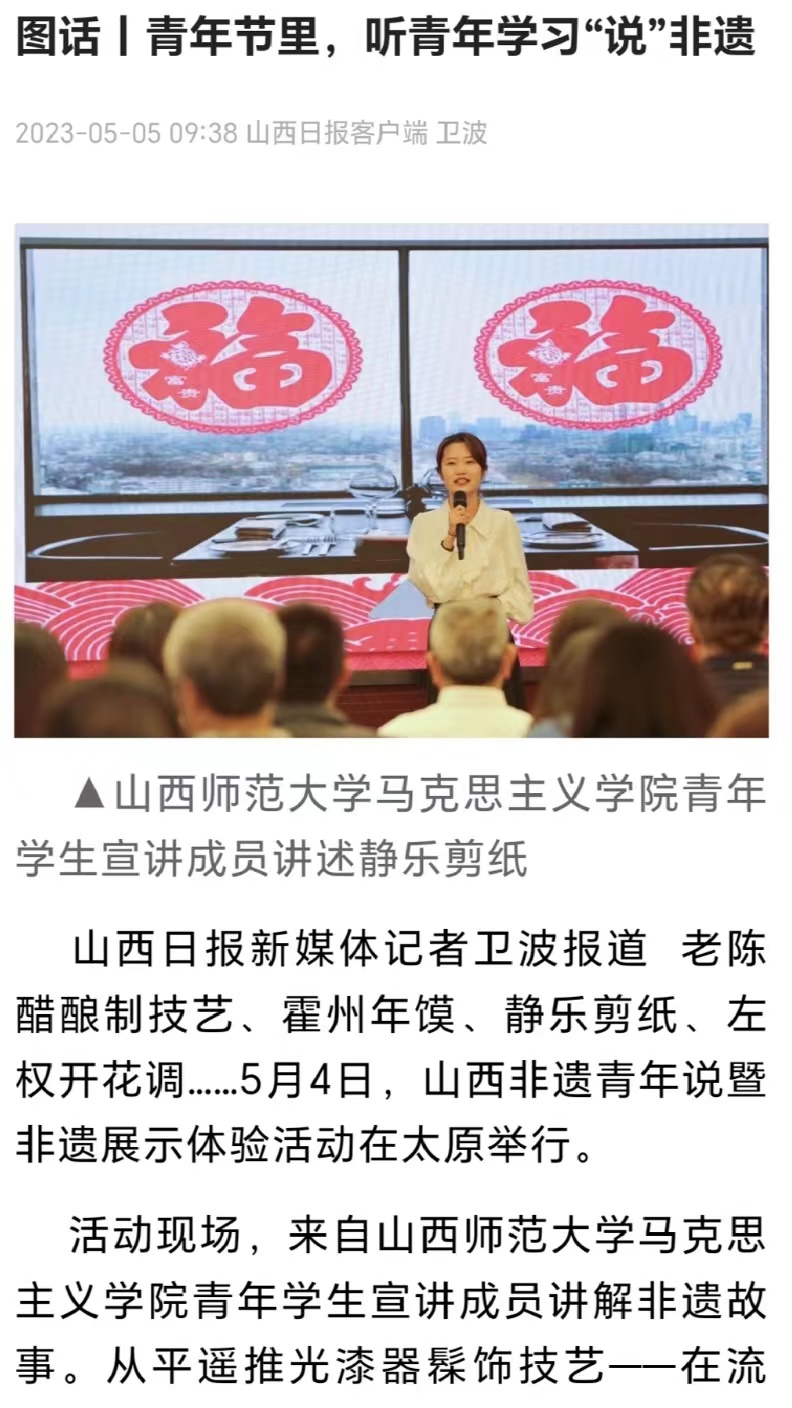 党的十八大以来,习近平总书记曾多次到山西考察调研,对文化传承作出重要指示、寄予殷切期望。为贯彻落实习近平总书记视察山西重要讲话精神,引导青年学生增强文化传承与创新的信心和决心,两年来,beat365中文唯一官网“山西非遗青年行”社会实践团队聚焦山西非遗,在山西省非物质文化遗产保护中心的大力支持下,开展了“山西非遗青年行+山西非遗青年说+山西非遗青年创+山西非遗青年研”系列活动,打造了“行—说—创—研”一体化研学流程,获得人民论坛网、人民日报视频客户端、人民网、中国青年报、文旅中国、山西省文旅厅、河南省文旅厅、山西日报山西青年报、山西农民报、中国大学生在线、高校辅导员工作室等多家权威机构和媒体的广泛报道。