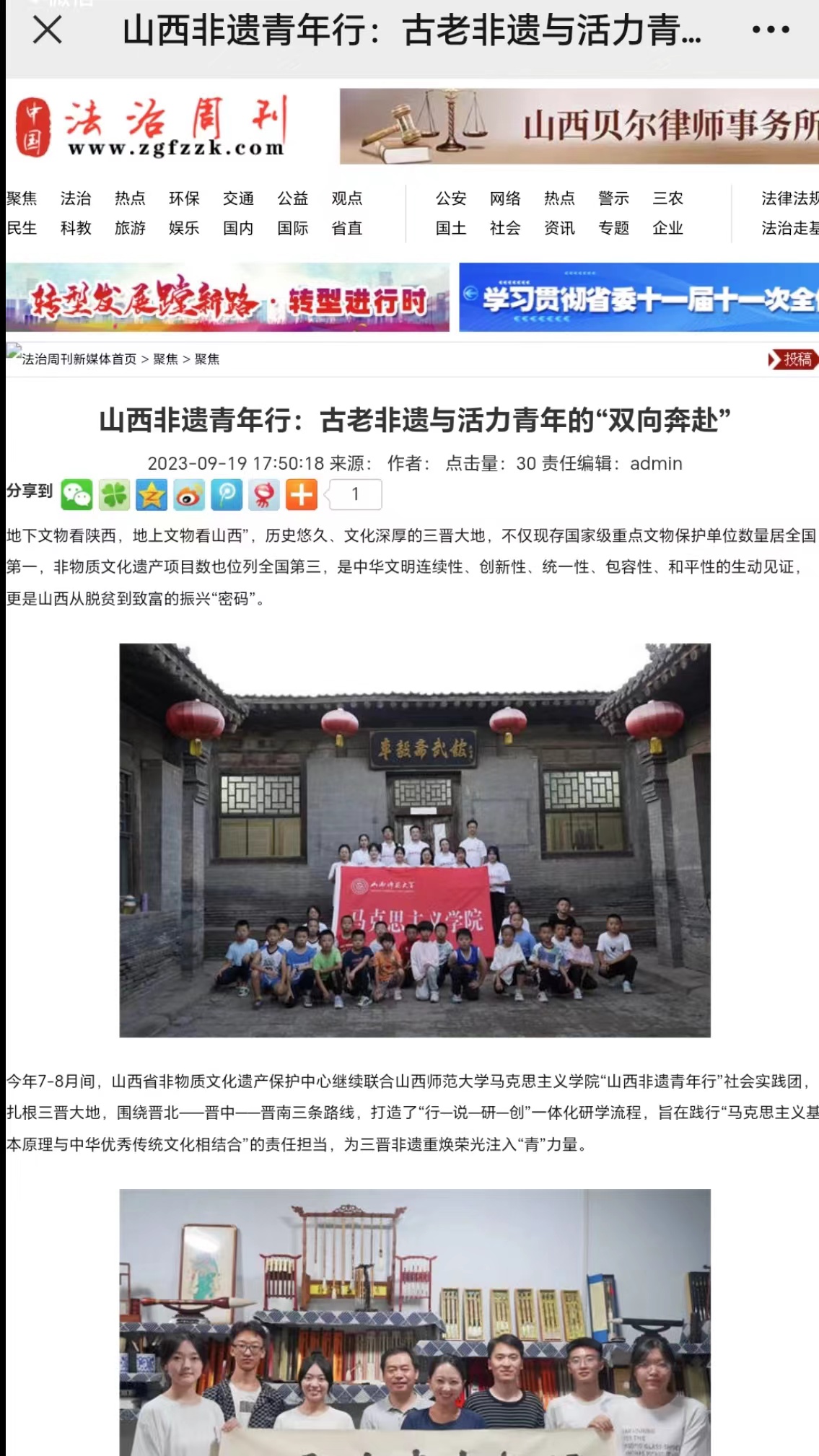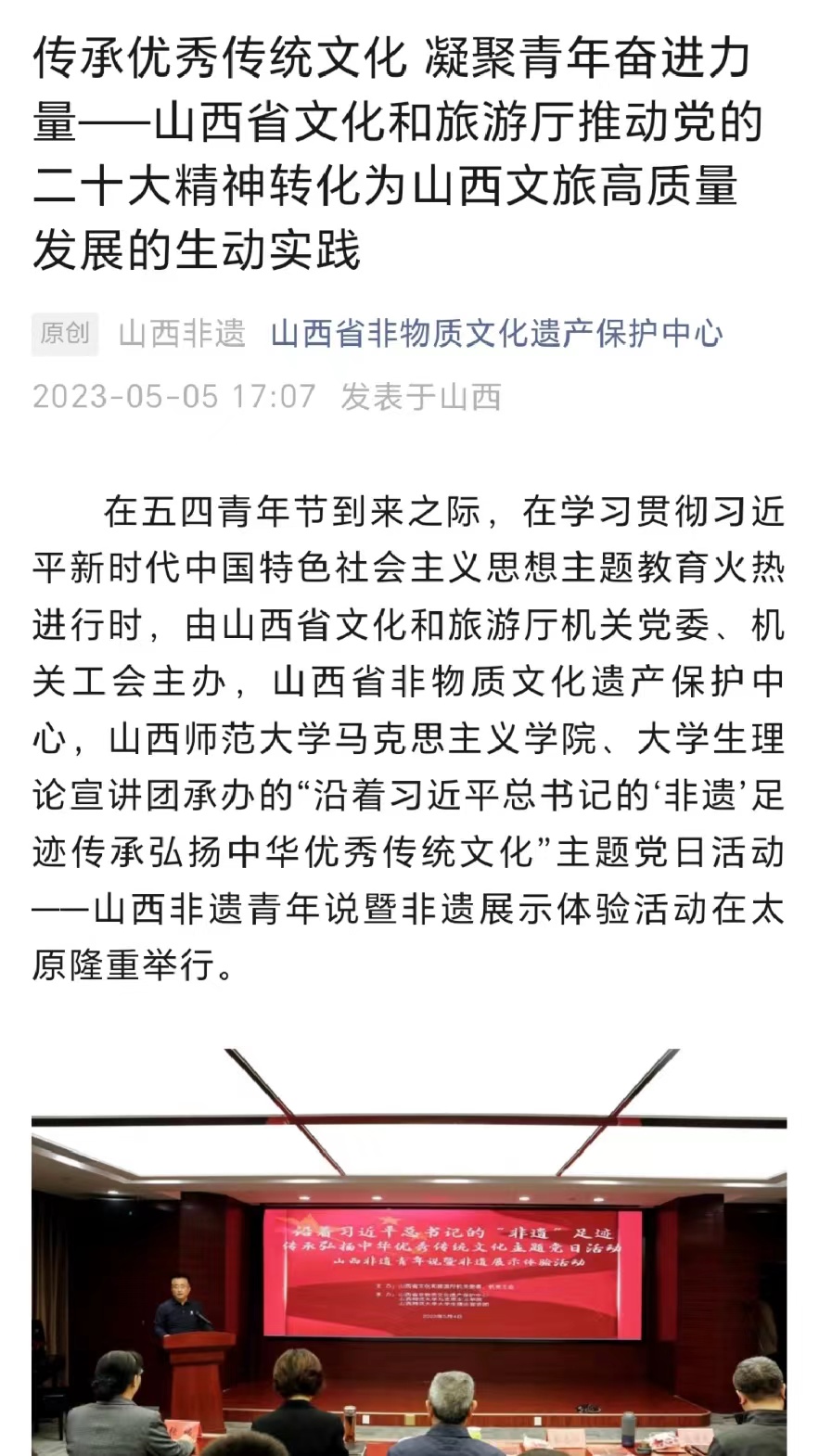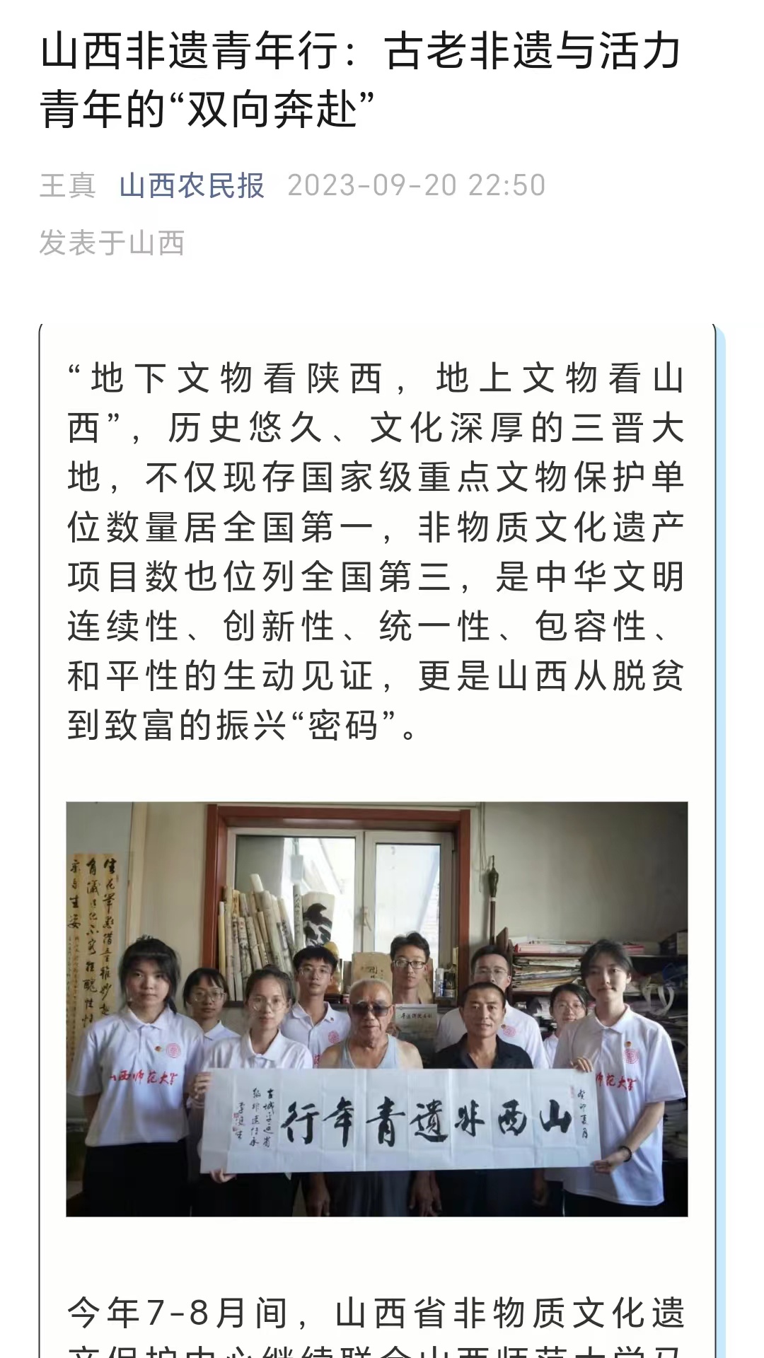党的十八大以来,习近平总书记曾多次到山西考察调研,对文化传承作出重要指示、寄予殷切期望。为贯彻落实习近平总书记视察山西重要讲话精神,引导青年学生增强文化传承与创新的信心和决心,两年来,beat365中文唯一官网“山西非遗青年行”社会实践团队聚焦山西非遗,在山西省非物质文化遗产保护中心的大力支持下,开展了“山西非遗青年行+山西非遗青年说+山西非遗青年创+山西非遗青年研”系列活动,打造了“行—说—创—研”一体化研学流程,获得人民论坛网、人民日报视频客户端、人民网、中国青年报、文旅中国、山西省文旅厅、河南省文旅厅、山西日报山西青年报、山西农民报、中国大学生在线、高校辅导员工作室等多家权威机构和媒体的广泛报道。