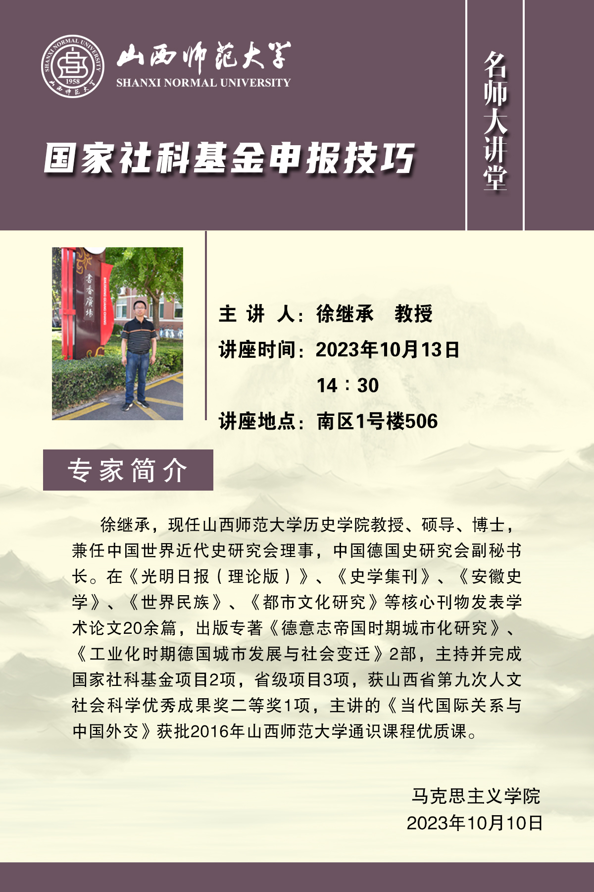 10月13日下午,beat365中文唯一官网邀请beat365历史与旅游文化学院徐继承教授在1506会议室举办了《国家社科基金申报心得与体会》的专项座谈交流。徐继承教授结合自身三次成功申报国家社科基金项目的实际,从准确定位基金类型、精准把握选题、强化推进论证等三个方面,与参会教师分享了他的成功经验与心得体会。