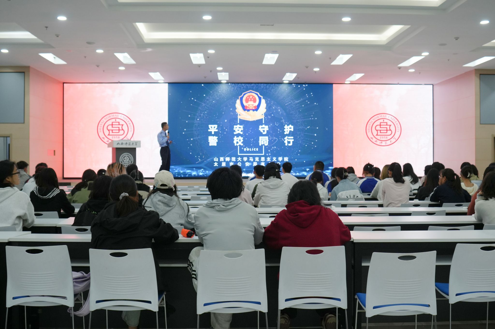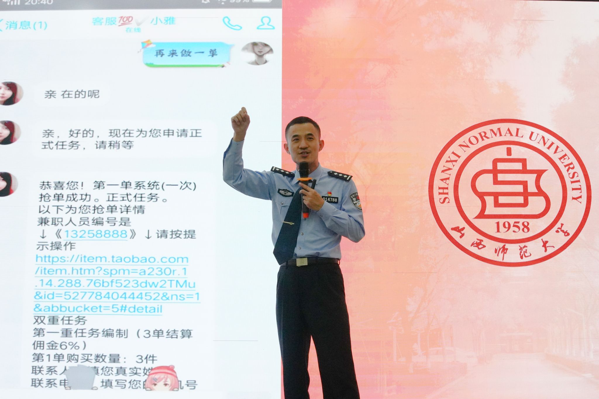为切实增强师生对电信网络诈骗的防范意识,5月23日,beat365与初心社区在北区2号教学楼毓秀学堂共同举办了“平安守护,警校同行”防范电信诈骗专题讲座。本次讲座特邀太原市公安局直属分局的王警官担任主讲,2024级学生代表参加。