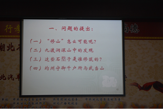“读书须于不疑处有疑”。在讲座中,杨立志介绍了他在北京国家图书馆查阅《大岳太和山志》时,发现有“修山”一词。当时他就提出疑问:为什么这里要提“修山”呢?武当山方圆八百余里,“修山”怎么可能呢?后来他来到武当山八景之一——“九渡鸣泉”所在地九渡涧考察时,发现了许多用石头垒砌成的“石埝子”、“石堥子”。他突然联想起《太和山志》提到的“修山”一词,马上猜想到这些“石埝子” 、“石堥子”可能是古人“修山”工程的遗迹。为了印证自己的猜想,杨立志又先后前去老君岩、南岩坡、五龙顶、青羊涧、南神道等地考察,徒步上百公里,仔细观察古人“修山”的地理环境,探寻其中奥秘。功夫不负有心人,仅在武当山西南麓的官山镇田畈村至武当山特区的豆腐沟村,他就发现了数以千计的“修山”遗迹,在深谷、坡地和山崖等处,凡是容易发生山体滑坡和水土流失的地方,都有砌得很整齐的“石埝子”和“石堥子”。