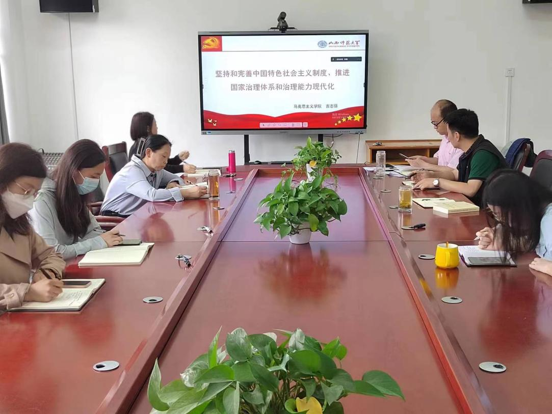 5月29日下午,按照院党委党支部学习贯彻习近平新时代中国特色社会主义思想主题教育部署要求,beat365守正创新党支部邀请beat365副院长吉志强讲授《坚持和完善中国特色社会主义制度、推进国家治理体系和治理能力现代化》专题党课,党课由支部书记杨海亮同志主持,支部全体党员参加学习。
