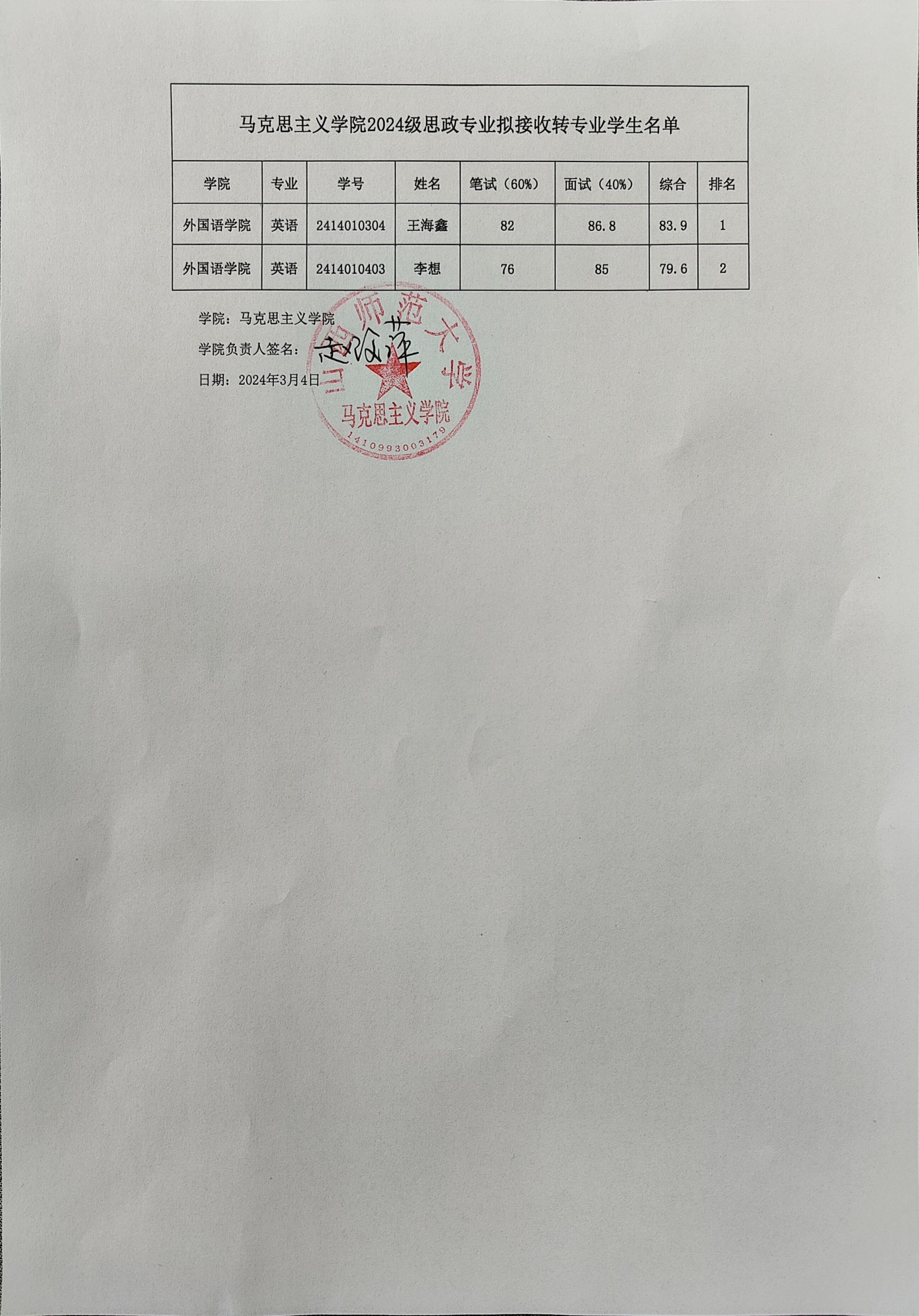 beat365中文唯一官网2024级思政专业拟接收转专业学生名单