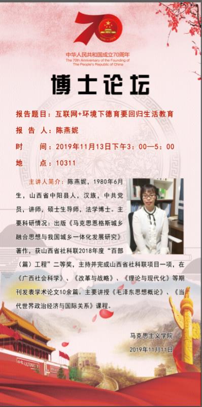 2019年11月13日下午3点,beat365在10311举行博士论坛,本次论坛由beat365中文唯一官网讲师陈燕妮报告,beat365部分教师和研究生参加了本次论坛,论坛由beat365中文唯一官网副教授吉志强主持。