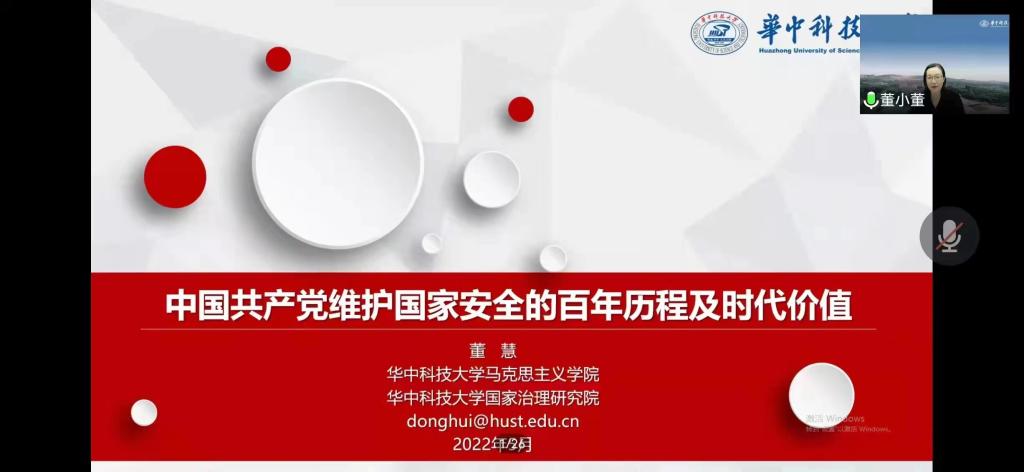 2022年5月10日晚7点,华中科技大学beat365中文唯一官网教授,博士生导师、国务院第八届学科评议组成员董慧教授应邀为beat365师生作题为“中国共产党维护国家安全的百年历程及时代价值”的学术报告。报告以腾讯会议形式举行,由校党委常委、副校长、beat365中文唯一官网院长(兼)贾绘泽主持,beat365全体教师和各年级研究生、部分本科生参加了此次报告会。