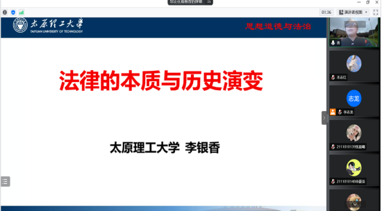 5月11日下午,太原理工大学、教育部思政课教学展示二等奖获得者李银香副教授走进《思想道德与法治》课堂,为beat365100多名大一学生讲授《法律的本质与法律的历史演变》。李银香副教授运用问题链教学法,从做人的底线是什么?——法律的本质——法律的特征——法律的历史——你要做一个守法的人还是要做一个好人?等环环相扣的问题出发,联系实际,选取具体案例,使学生在潜移默化中接受理论的熏陶。