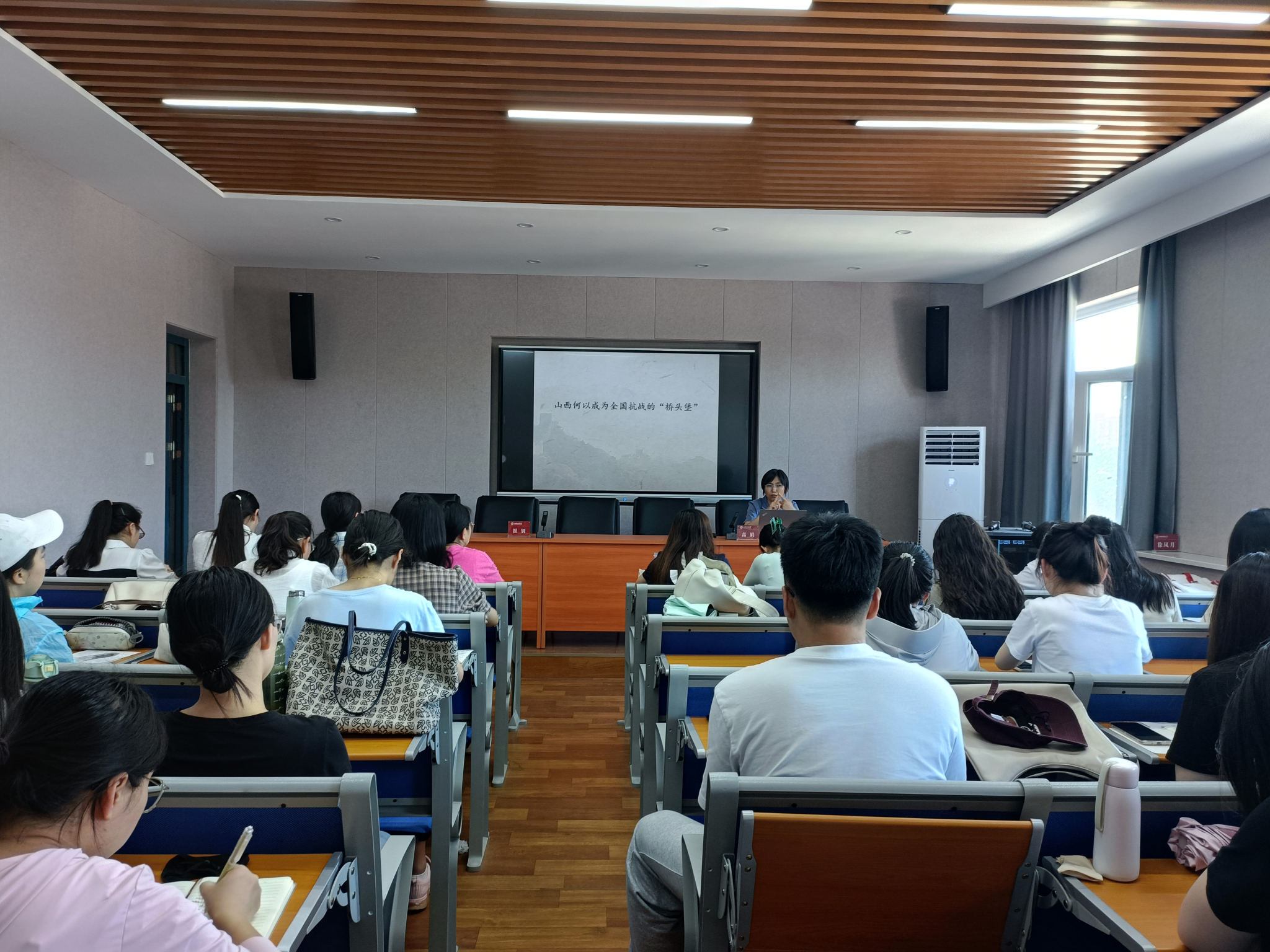 其次,高娟老师作了题为《山西何以成为全国抗战的“桥头堡”》的报告。她从以下两个方面论述了山西在全国抗战中的重要作用。第一,她指出山西是华北敌后抗战的中心、战略支点,是百团大战的主要战场,山西最早成功实践党的抗日民族统一战线。她还介绍了毛泽东同志提出的“经营山西”战略构想及其实施情况,讲述了其在政治上、军事上的重要意义。