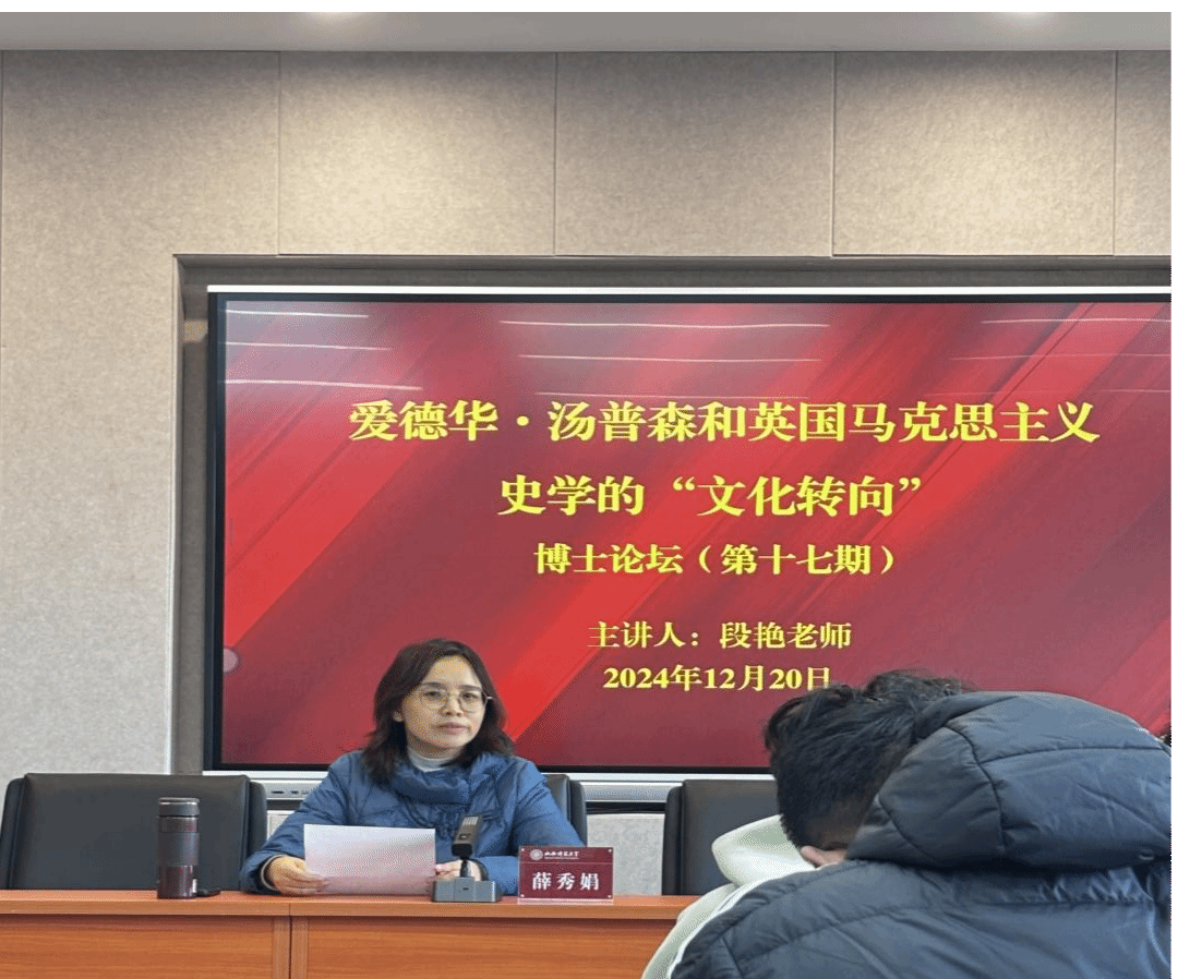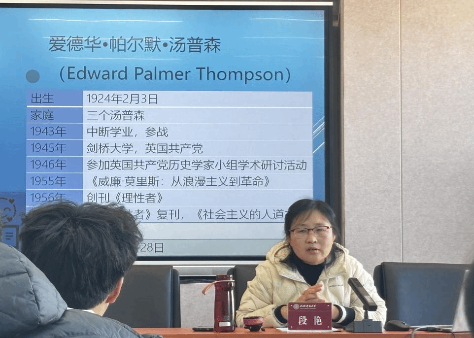 接着,段艳老师以《爱德华·汤普森和英国马克思主义史学的“文化转向”》为题作报告。她从汤普森年谱、汤普森和英国马克思主义史学“文化转向”的生成机制、汤普森和英国马克思主义史学“文化转向”的理论诉求和史学实践这三个方面作了此次报告。