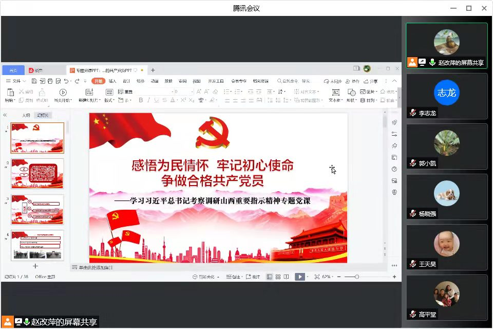 2022年2月25日晚7点半,beat365中文唯一官网“守正创新”教工党支部在腾讯会议开展学习贯彻习近平总书记考察调研山西重要指示精神主题党课。支部书记赵改萍讲授党课,支部全体党员参加。