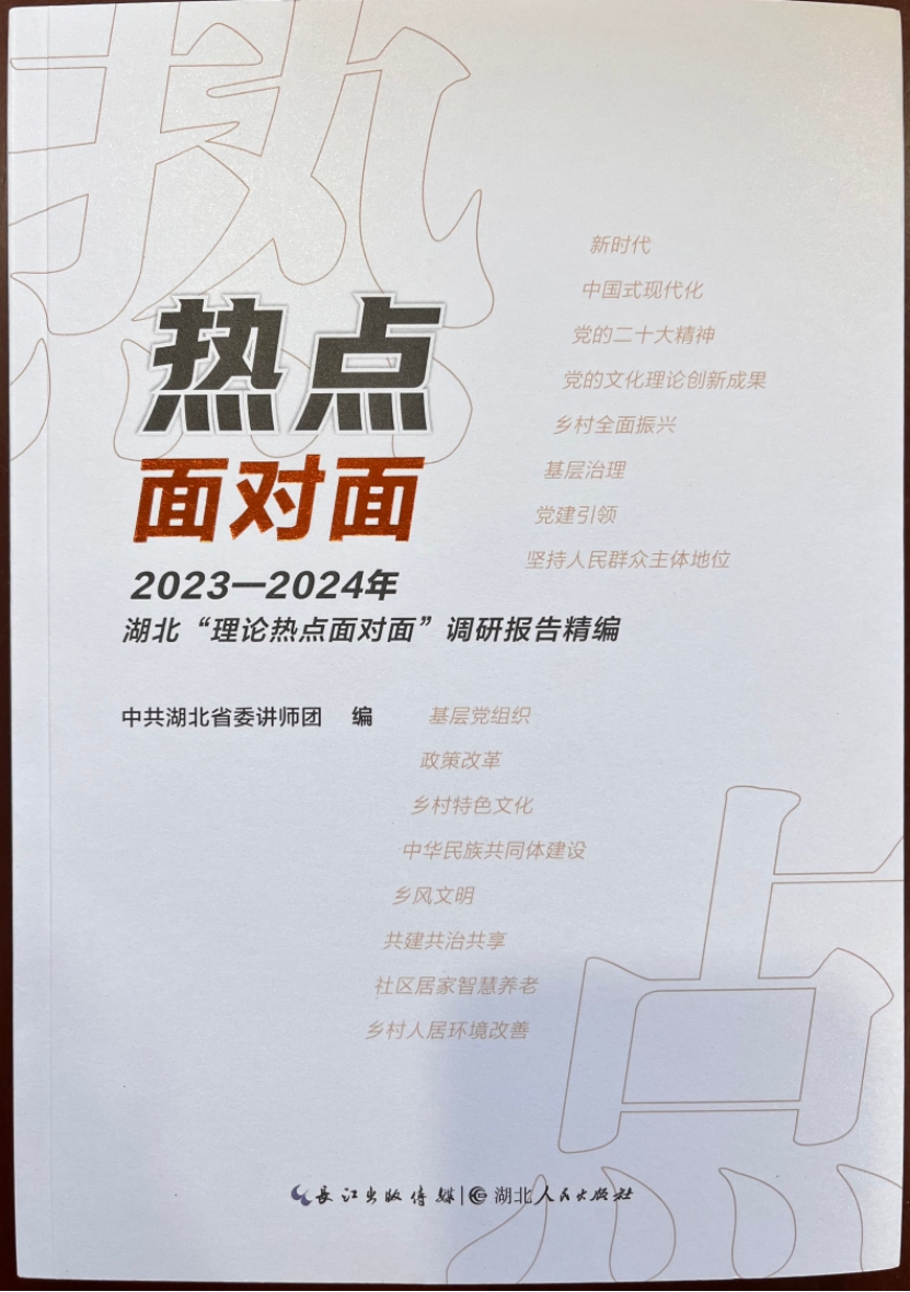 (文:方垚、马保青)近日,中共湖北省委讲师团出版《热点面对面:2023—2024年湖北“理论热点面对面”调研报告精编》一书,该书由长江出版传媒集团编印、湖北人民出版社出版。pg游戏pg游戏电子模拟器马保青调研团队所著《以基层共同治理推动乡村治理现代化——基于竹山县10个试点的调查》和方垚调研团队所著的《乡村特色文化的传承、发展与展望——基于竹山县的调查》两篇调研报告被收录其中。两篇调研报告分别于2023、2024年获得湖北省社科基金后期资助“理论热点面对面”专项立项,为其资助研究成果。