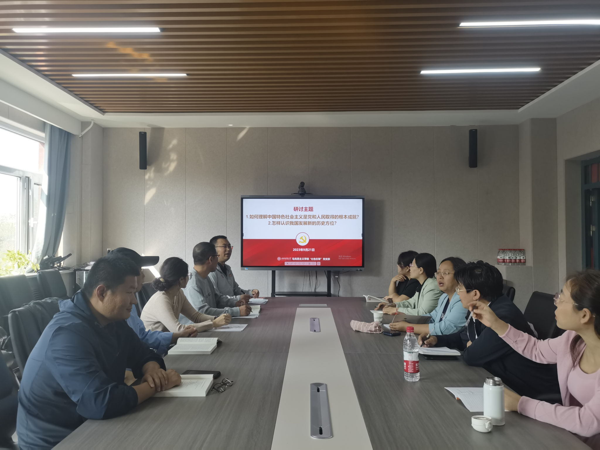 在研讨环节,全体党员围绕以下两个主题分别谈了自己学习体会:1.如何理解中国特色社会主义是党和人民取得的根本成就?2.怎样认识我国发展新的历史方位?全体党员一致认为,中国特色社会主义是党和人民经过艰辛探索、付出巨大代价才取得的伟大成就,必须倍加珍惜、始终坚持。面对纷繁复杂的国内外形势,我们必须发扬斗争精神、积极把握历史主动,力争在新的历史方位上早日实现强国建设、民族复兴的战略目标。