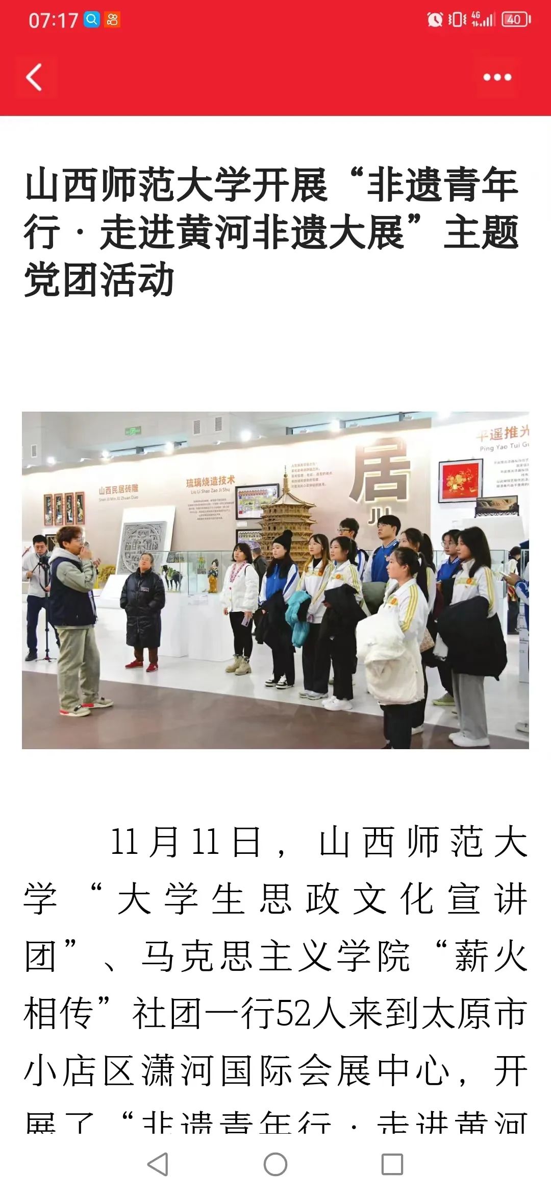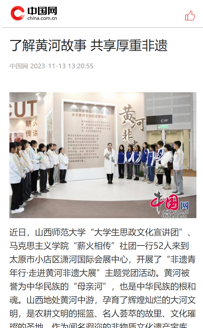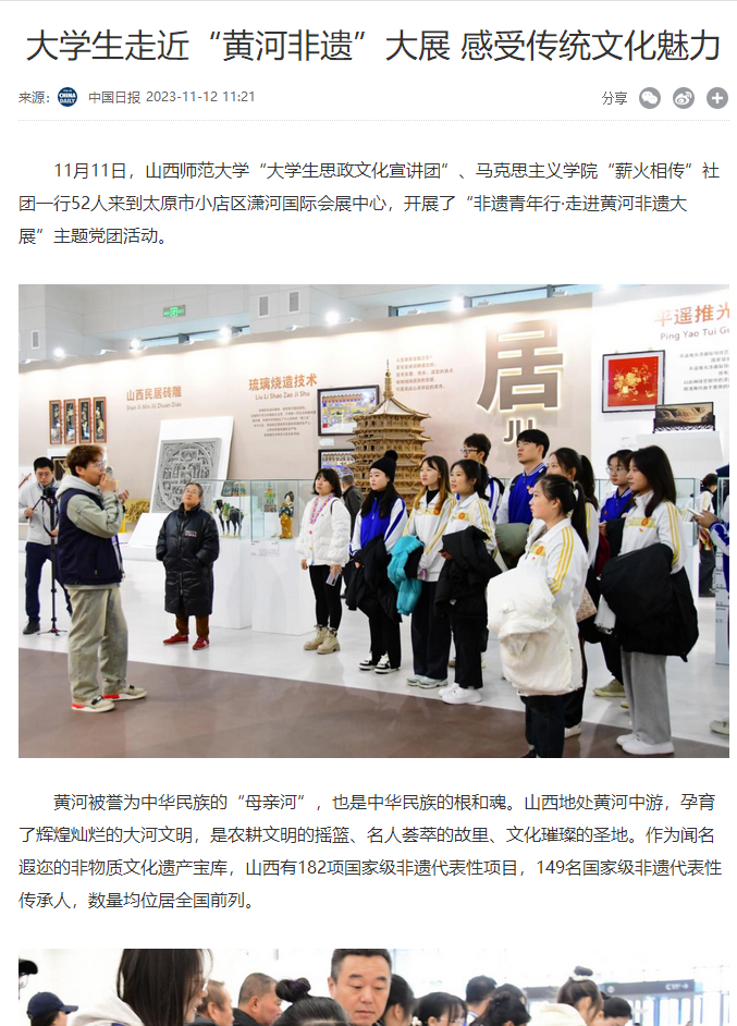 为贯彻落实习近平总书记考察山西重要指示精神,引导青年积极投身于文化传承与创新的实践中去,为非遗的保护与传承注入新活力,11月11日上午,beat365团委联合beat365中文唯一官网“薪火相传”党支部开展了“以文化人 凝心铸魂——非遗青年行·走进黄河非遗大展”主题党团活动,beat365团委学生会各部门学生代表、本科生“薪火相传”党支部师生代表、青马骨干培训班学生代表以及大学生理论宣讲团学生代表共同参加。