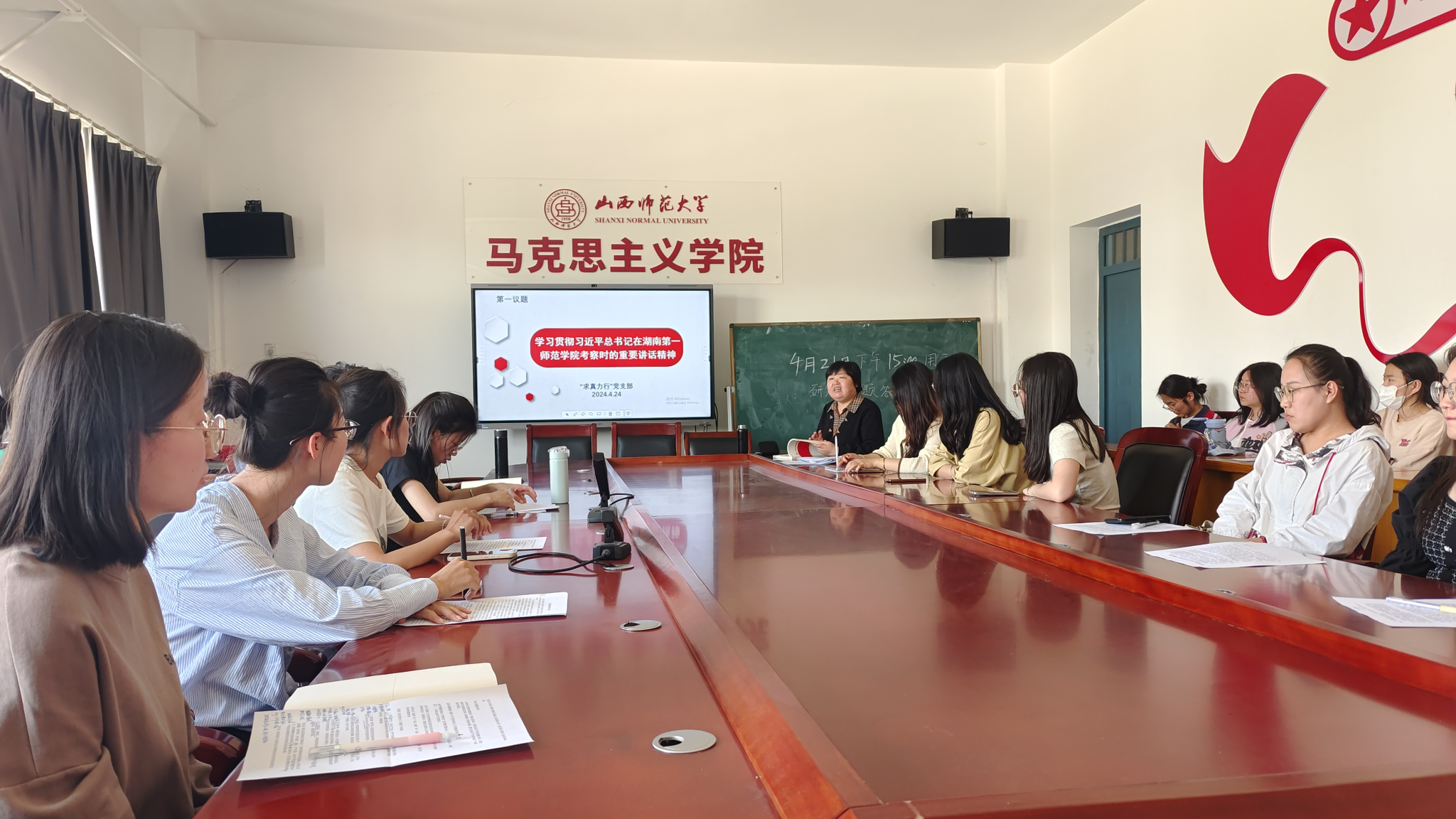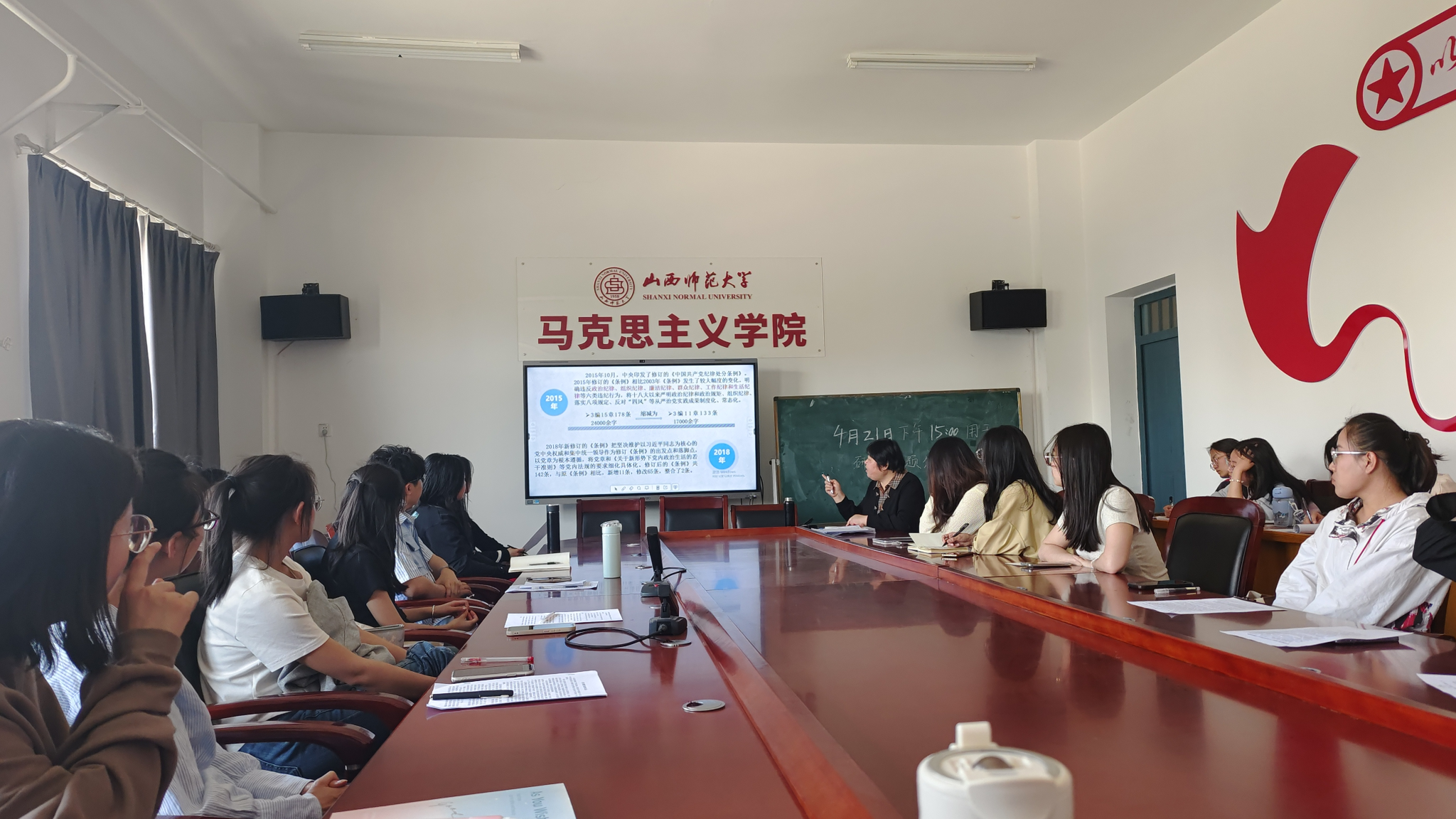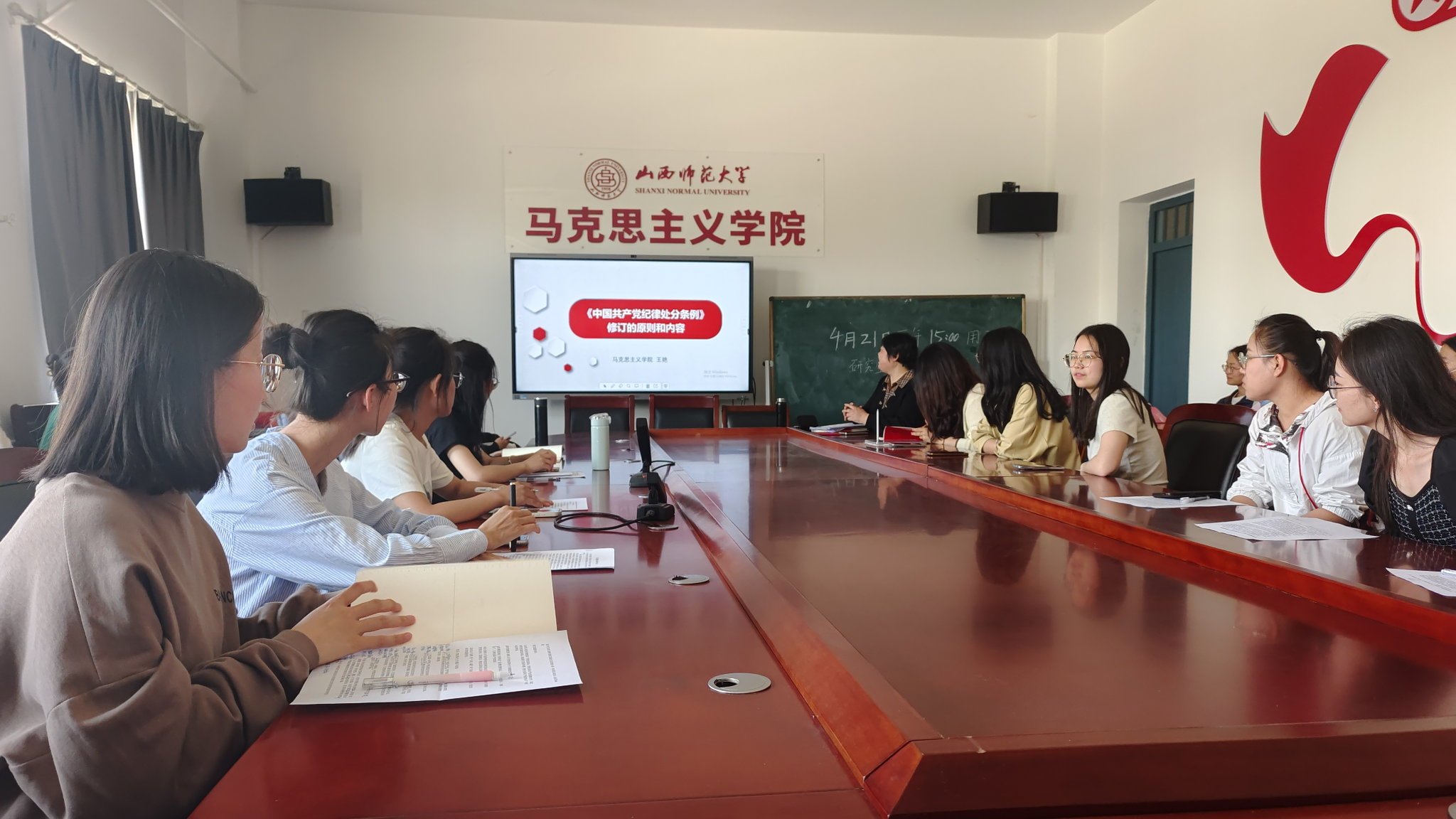 支部书记王艳传达学校、学院党纪学习教育动员部署会议精神,解读院党委《关于开展党纪学习教育的实施方案》的要求和具体安排。随后,以“《中国共产党纪律处分条例》修订的原则和内容”为题,解读党的二十大后《条例》再次修订的原因、原则和特点,并带领大家逐条学习《条例》新修订条款。