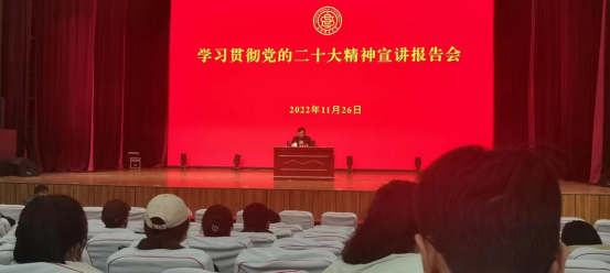 首先,贾校长向全校参会人员宣传党的二十大精神,宣传内容包括党的二十大主题及主要成果、总结过去五年工作和十年伟大变革、马克思主义中国化和时代化、习近平新时代中国特色社会主义思想的内容和中国式现代化。