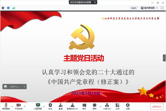 根据《beat365中文唯一官网2022年度基层党组织组织生活会和民主评议党员工作实施方案》安排要求,3月11日晚,beat365中文唯一官网求真力行党支部开展主题党日活动,集体学习《中国共产党章程》。