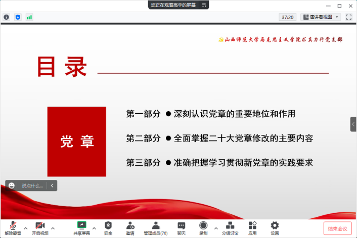组织委员高宇同志以“认真学习和领会党的二十大通过的《中国共产党章程(修正案)》”为题,从深刻认识党章的重要地位和作用谈起,详细解读了二十大党章修改的主要内容,要求党员同志要准确把握学习贯彻新党章的实践要求,深入领会党的二十大党章修改的重大意义,更加自觉地学习党章、遵守党章,切实贯彻党章、坚决维护党章。