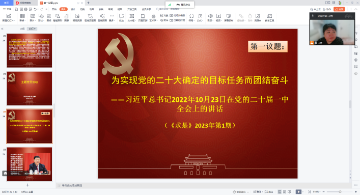 支部书记王艳首先带领大家学习了习近平总书记2022年10月23日在党的二十届一中全会上的讲话“为实现党的二十大确定的目标任务而团结奋斗”。大家进一步学习了党的二十大精神的丰富内涵、精神实质、重大意义;明确了为实现党的二十大确定的目标任务要着重做好的六个方面的工作,对照牢记“国之大者”、全面增强本领、增强斗争精神、保持清正廉洁四个要求进行了自我批评。