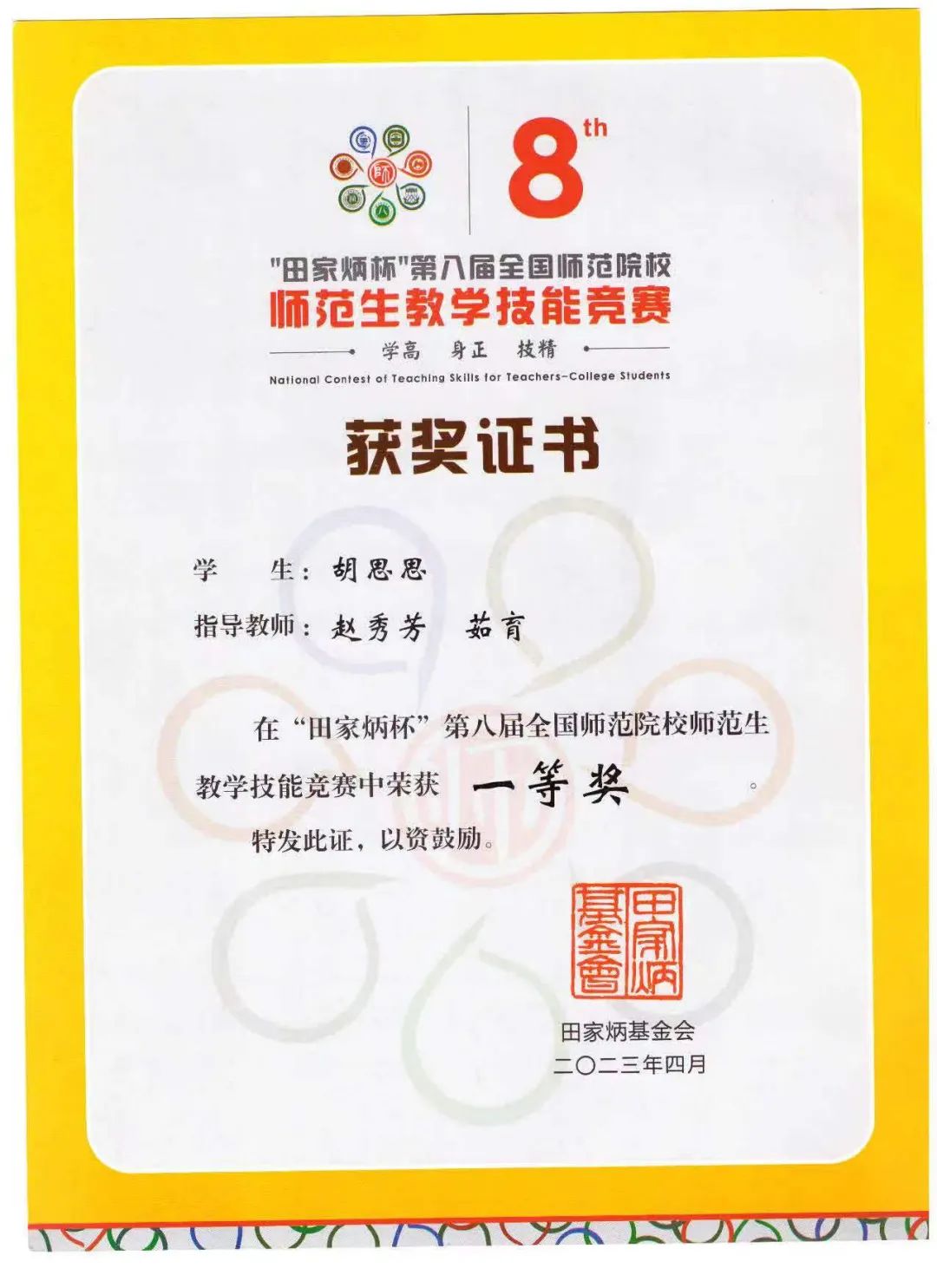 2023年4月15日至16日,“田家炳杯”第八届全国师范院校师范生教学技能竞赛决赛在浙江师范大学举行。beat365思想政治教育专业2020级学生胡思思(指导老师:赵秀芳、茹育)荣获一等奖。这是beat365在本科生培养工作中取得的突破性成绩。